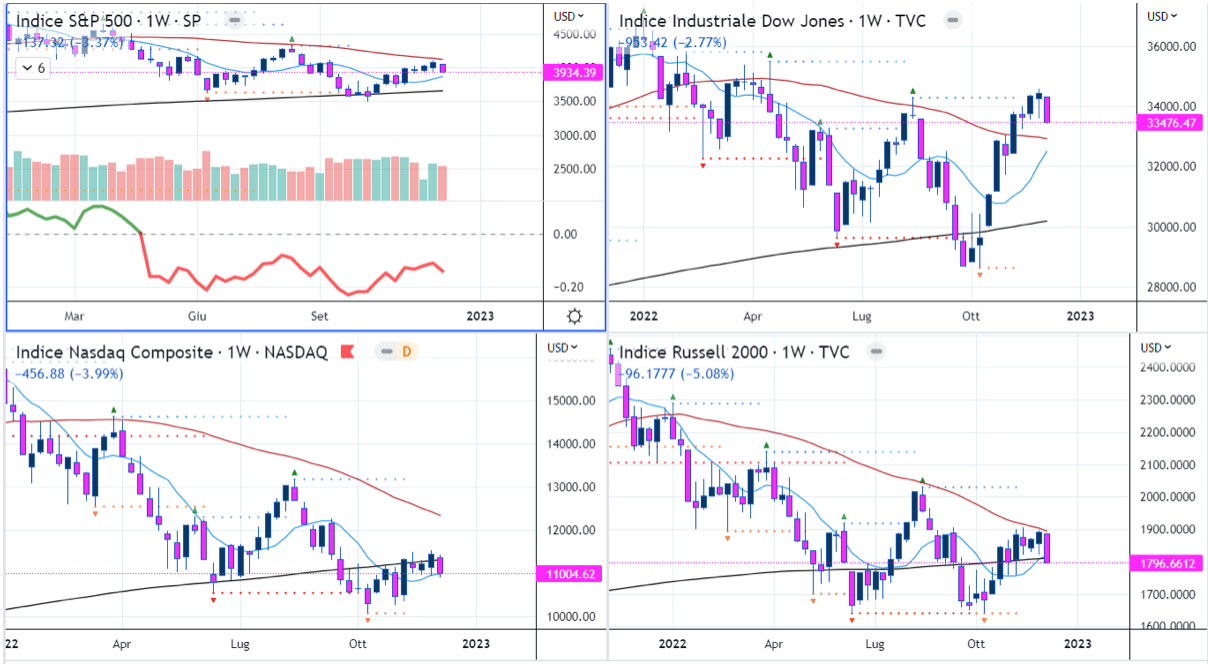 Massima attenzione alla reazione ai dati macro in uscita durante la settimana. Anche un eventuale rimbalzo degli indici non deve trarre in inganno, visto che fino a prova contraria (comparsa di numerosi setup bullish su tech, discrezionali e sanitario) sarà la ripetizione del pattern visto in questo 2022.