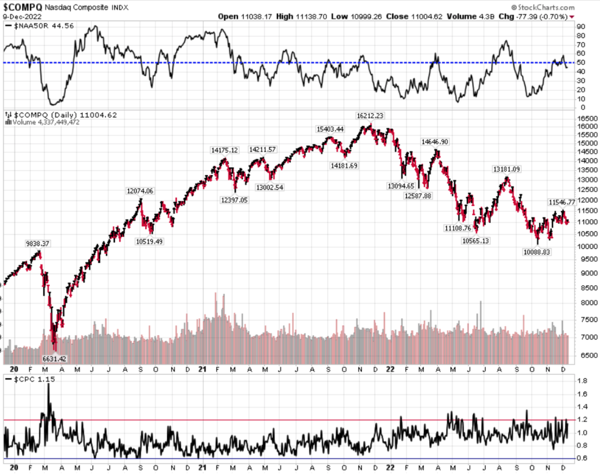 Divergenza $NAAR50 vs $COMP: diminuzione della percentuale di titoli che prezzano sopra la SMA50  rispetto alla settimana precedente, in convergenza con il calo dell’indice.