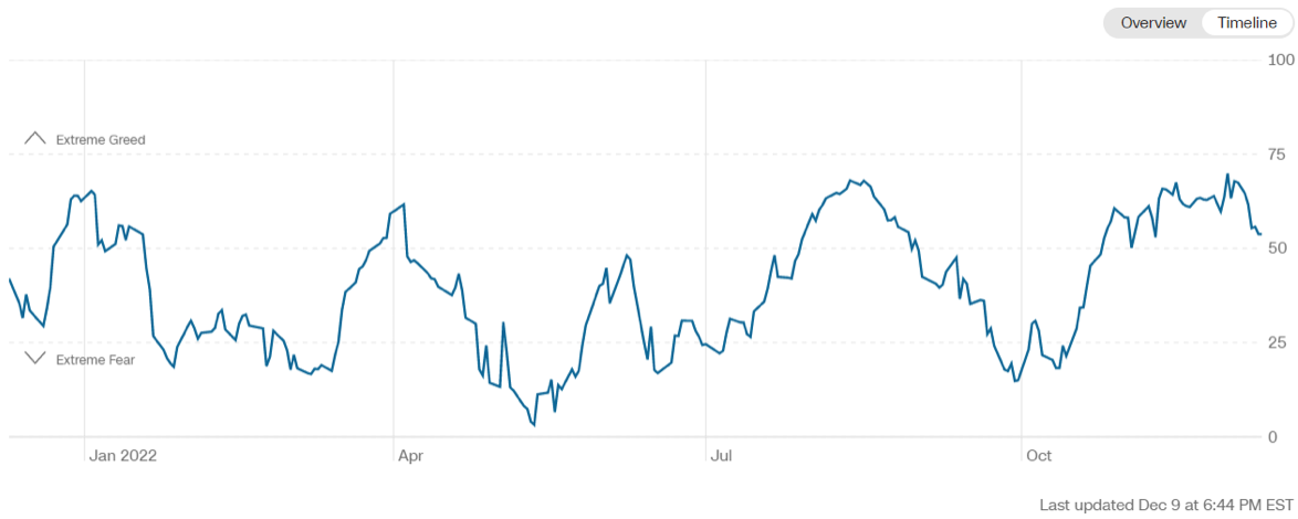 Il Fear&Greed Index scende a quota 54, indicando l’equilibrio tra paura ed avidità come sentiment prevalente. Una settimana fa il valore era pari a 67.