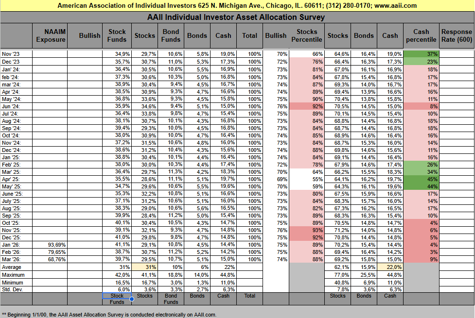 I miei dati aggiornati al 31 marzo 2026 mostrano che il posizionamento resta ancora chiaramente orientato verso l’azionario. L’esposizione NAAIM è al 68,76%, mentre l’AAII segnala un’allocazione media alle azioni del 69,2% e una liquidità al 15,0%. Siamo sotto i picchi più estremi visti nei mesi scorsi, ma restiamo comunque in un contesto di propensione al rischio ancora elevata rispetto alla storia.