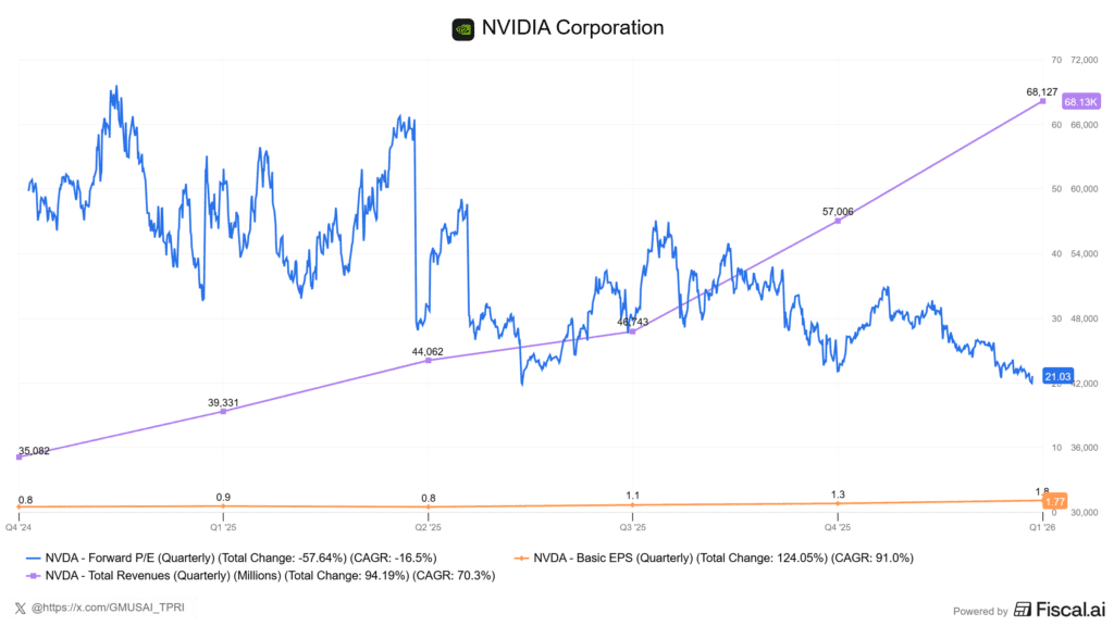 Nvidia oggi tratta a 21 volte gli utili forward. È un multiplo inferiore a quello che aveva il giorno prima del suo report di maggio 2023, il trimestre che ha segnato l’inizio del boom AI. Le azioni sono salite del 475% da allora. Il multiplo è sceso. Chi parla di bolla dovrebbe spiegare come si forma una bolla quando la valutazione relativa ai fondamentali si comprime mentre il prezzo sale.