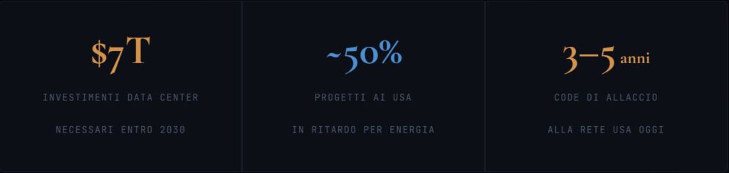 Microsoft, Alphabet e Amazon, tre aziende con più liquidità disponibile di molti stati sovrani, si trovano in questa situazione paradossale: hanno i chip, hanno i soldi, non riescono ad avere un allaccio elettrico in tempo utile. Le code di interconnessione alla rete si estendono da tre a cinque anni negli USA. I terreni con energia a basso costo e climi favorevoli sono quasi esauriti. I diritti sull’acqua per il raffreddamento sono sotto scrutinio regolatorio in tutto l’ovest americano.
