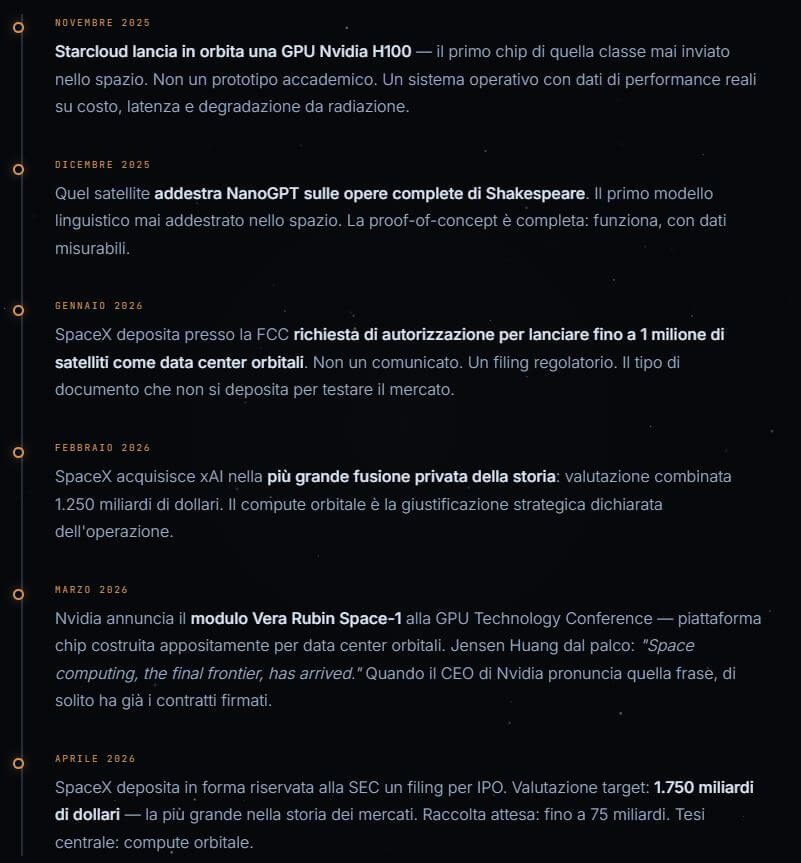 Il compute orbitale non è solo una storia tecnologica. È una storia su dove risiederà il potere computazionale, e quindi economico, nel decennio che viene.