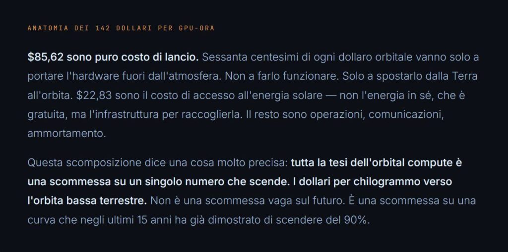 Oggi, in un data center terrestre davvero all’avanguardia, far girare una GPU equivalente a una H100 per un’ora costa circa 1 dollaro. Tutto incluso: ammortamento hardware, elettricità, raffreddamento, struttura, rete, personale. Un dollaro per GPU-ora. Questo è il benchmark ideale.