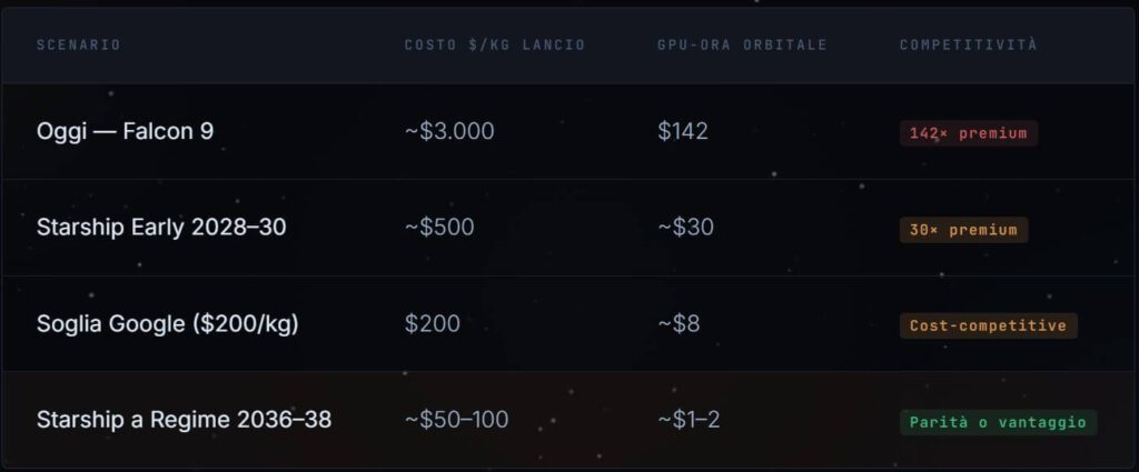 Starship, il sistema di prossima generazione di SpaceX, è progettato per portare quel costo dagli attuali ~3.000 dollari al chilogrammo a qualcosa nell’intervallo 50-100 dollari al chilogrammo a regime di produzione. Un team di ingegneri di Google ha pubblicato uno studio che conclude: a 200 dollari al chilogrammo, il compute orbitale diventa cost-competitive con quello terrestre.