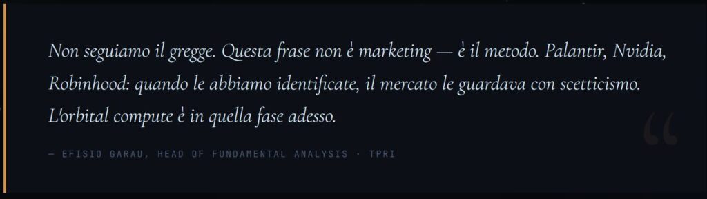 Oggi il compute orbitale esiste come segnali disconnessi. L’S-1 obbligherà ogni investitore istituzionale e ogni strategy team di Microsoft, Google, Amazon e Meta a formarsi una posizione scritta, documentata, con implicazioni finanziarie concrete. Non si potrà più ignorarlo. Dovranno rispondere alla domanda: sono posizionato, o sono indietro?