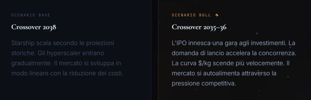 La nostra analisi stima il crossover economico attorno al 2038. Quel momento in cui il compute orbitale da opzione premium diventa l’opzione a basso costo per l’inferenza AI. Ma qui c’è la cosa che la maggior parte degli investitori non coglie: il crossover non è il momento in cui si entra nell’investimento. È il momento in cui l’investimento ha già reso.