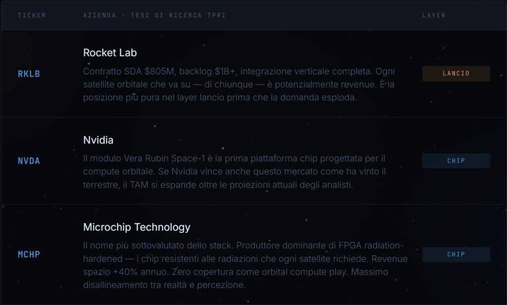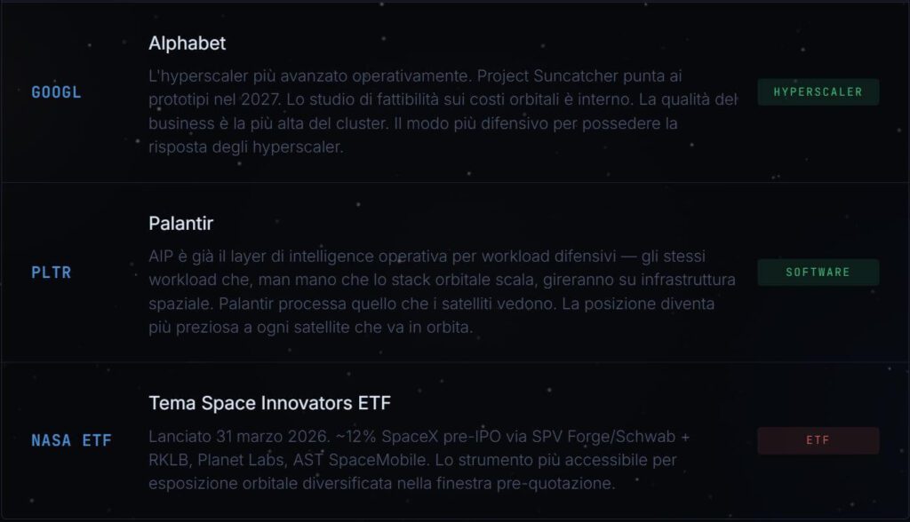 L’ingresso competitivo degli hyperscaler crea domanda di lancio che eccede la capacità di SpaceX, e quindi finanzia Rocket Lab, Blue Origin e ULA a scalare. La concorrenza nell’offerta di lancio è il meccanismo più diretto per accelerare la curva del costo al chilogrammo. Il successo di SpaceX finanzia la propria concorrenza. Il paradosso è reale, e rende la tesi ancora più solida.