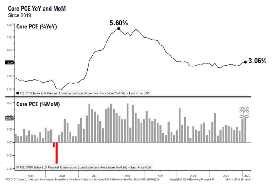 Anche l’inflazione continua a mostrarsi ostinata agli occhi di Powell. Il PCE su base annua è salito al 3,06% a gennaio, rispetto al 2,78% di un anno prima, mentre le ultime due letture mensili si sono entrambe attestate allo 0,36%, ben lontane da un percorso convincente verso il target del 2%. Powell lo ha riconosciuto apertamente, sottolineando come il miglioramento atteso ci sia, ma proceda più lentamente del previsto. Questo punto è cruciale, perché non si tratta di un’inflazione “bloccata”, bensì di un processo di disinflazione che sta rallentando: il percorso verso i tagli resta aperto, ma dipende sempre più dai dati (che novità).