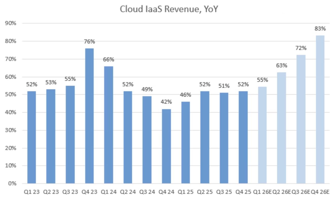 Se la crescita sequenziale dei ricavi sarà più sostenuta nella seconda metà dell’anno, i ricavi IaaS potrebbero accelerare ulteriormente, raggiungendo un intervallo compreso tra l’80% basso e medio.