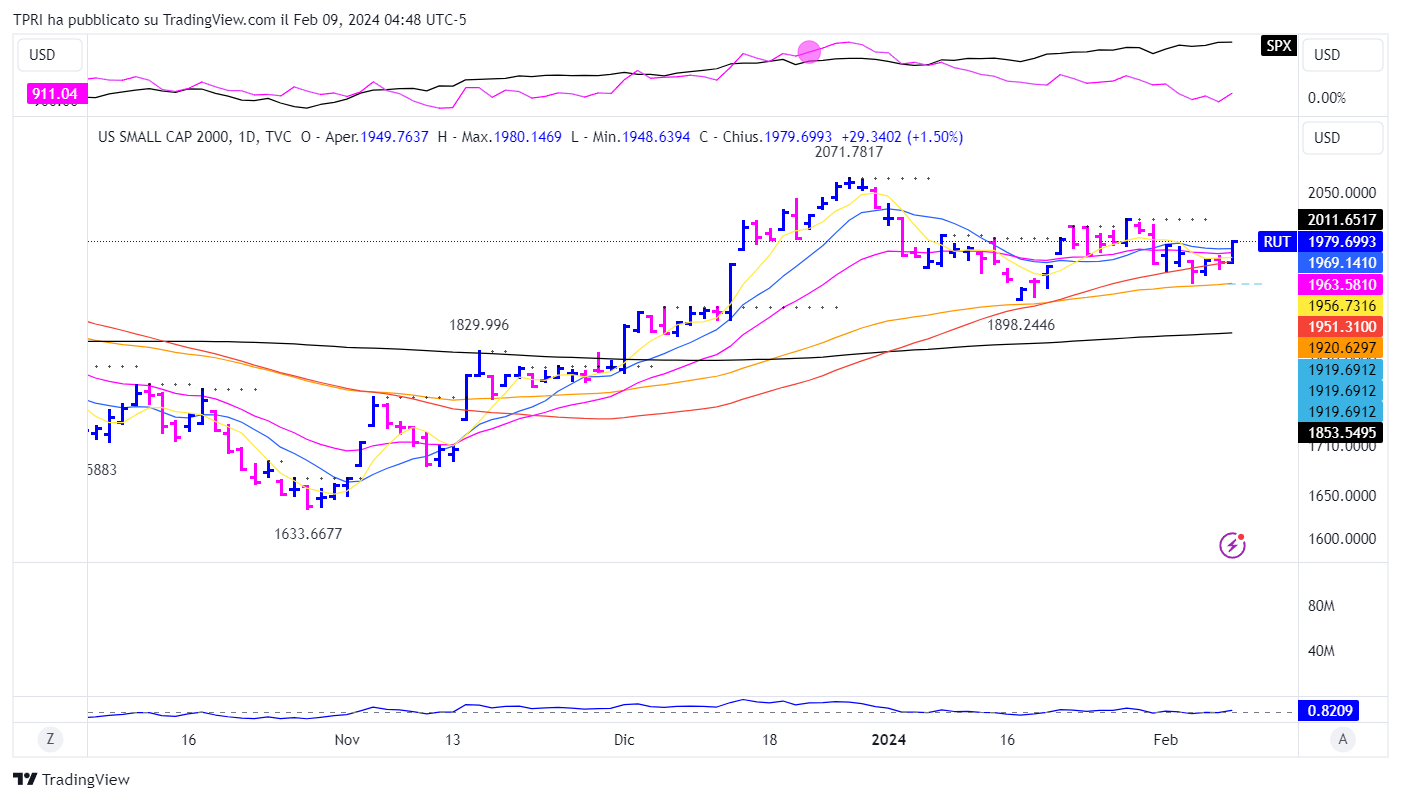 Il breadth si è allargato alle small-cap, con il Russell2000 che è balzato dell’1,5%, riconquistando la SMA50D e tornando sopra la EMA21D.