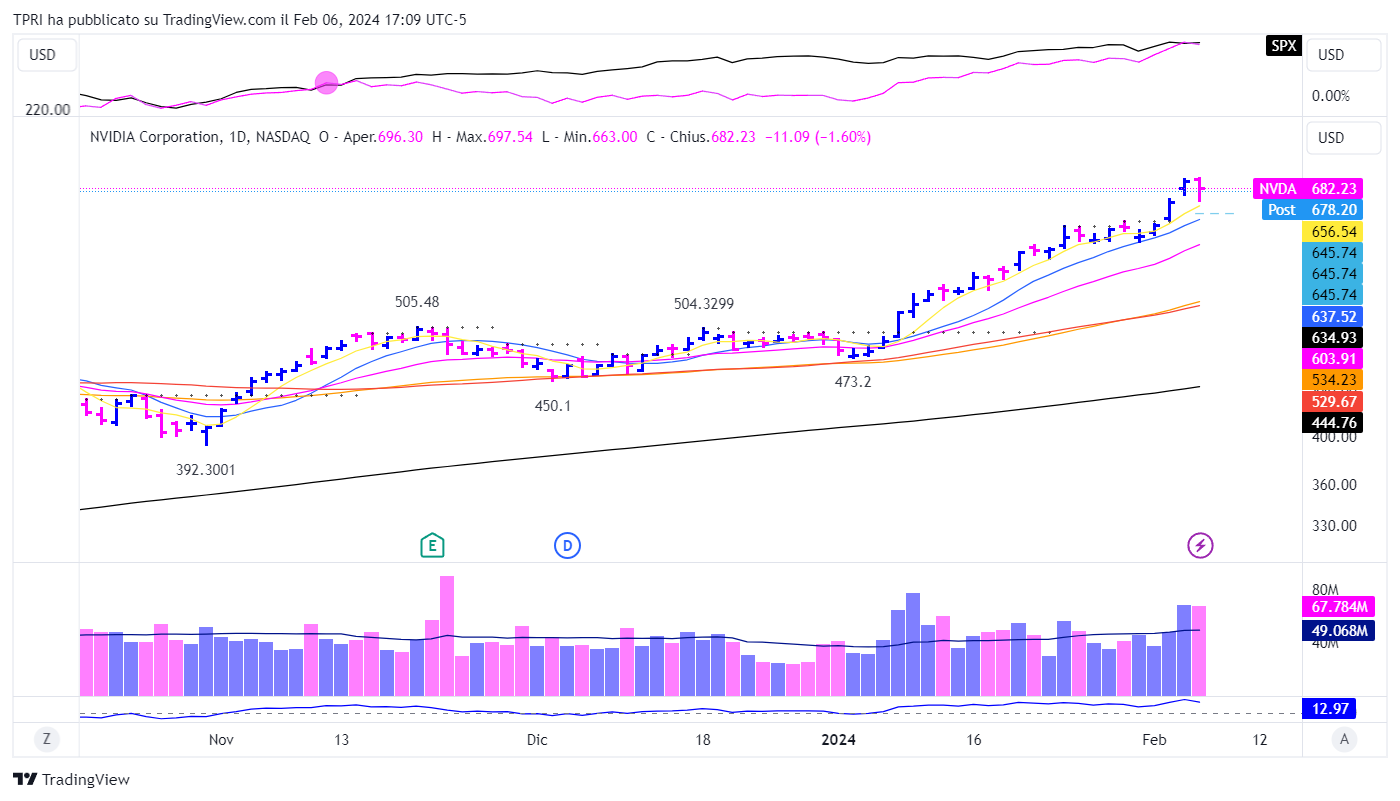 Il titolo ha chiuso in rialzo del 4,8% lunedì a 693,32 dollari, stabilendo un nuovo massimo storico in chiusura. Le azioni sono state sostenute dai report degli analisti di Goldman Sachs e Raymond James, che sostengono che Nvidia possa continuare il suo forte trend.