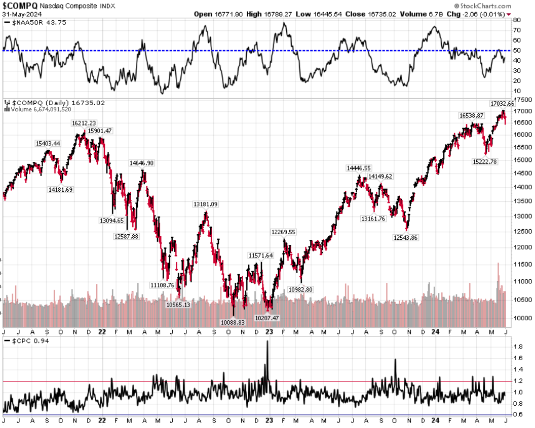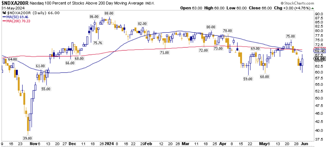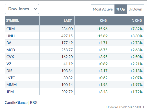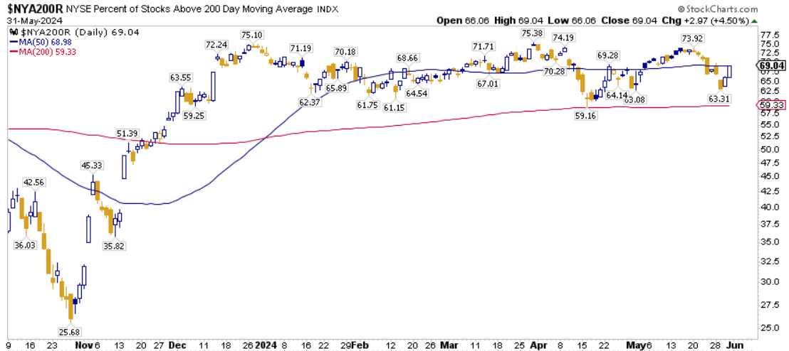 Il Dow Jones ha avuto la sua migliore sessione del 2024, con un rialzo dell’1,5%, ma resta ancora sotto la SMA50D. L’indice delle blue-chip è aumentato del 2,3% a maggio.
