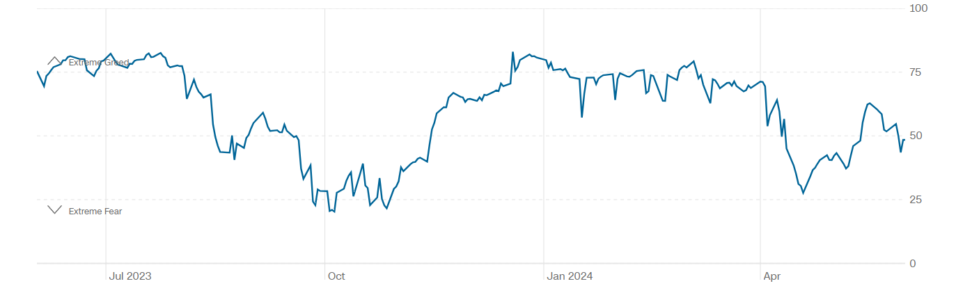 Il Fear&Greed Index scende a quota 48, indicando la neutralità come il sentiment prevalente. Una settimana fa il valore era pari a 53.