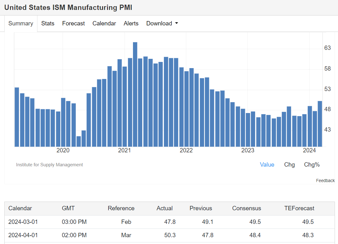 Il Purchasing Managers’ Manufacturing Index di marzo ha segnato il 51,9 rispetto alla stima di 52,5. E l’Institute for Supply Management ha riportato una lettura per marzo di 50,3, superando il 48,4 previsto per l’indice. Numeri superiori a 50 su entrambi gli indici indicano generalmente espansione, mentre letture al di sotto di 50 segnalano contrazione.