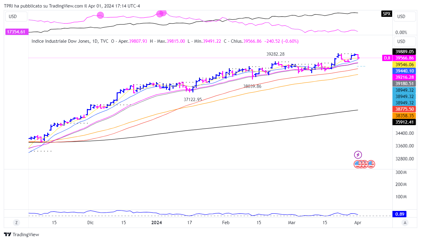 Il Dow Jones è sceso dopo aver “assaggiato” lo storico traguardo dei 40,000 punti. L’S&P500 e il Nasdaq hanno invertito la rotta a ribasso dopo essersi avvicinati a nuovi record.