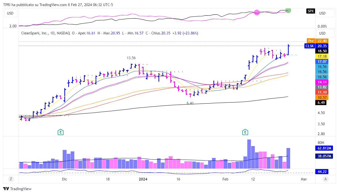 CleanSpark (CLSK), è cresciuta quasi del 24% ai massimi da novembre 2021. Molto bene anche COIN, MARA, MSTR, RIOT.