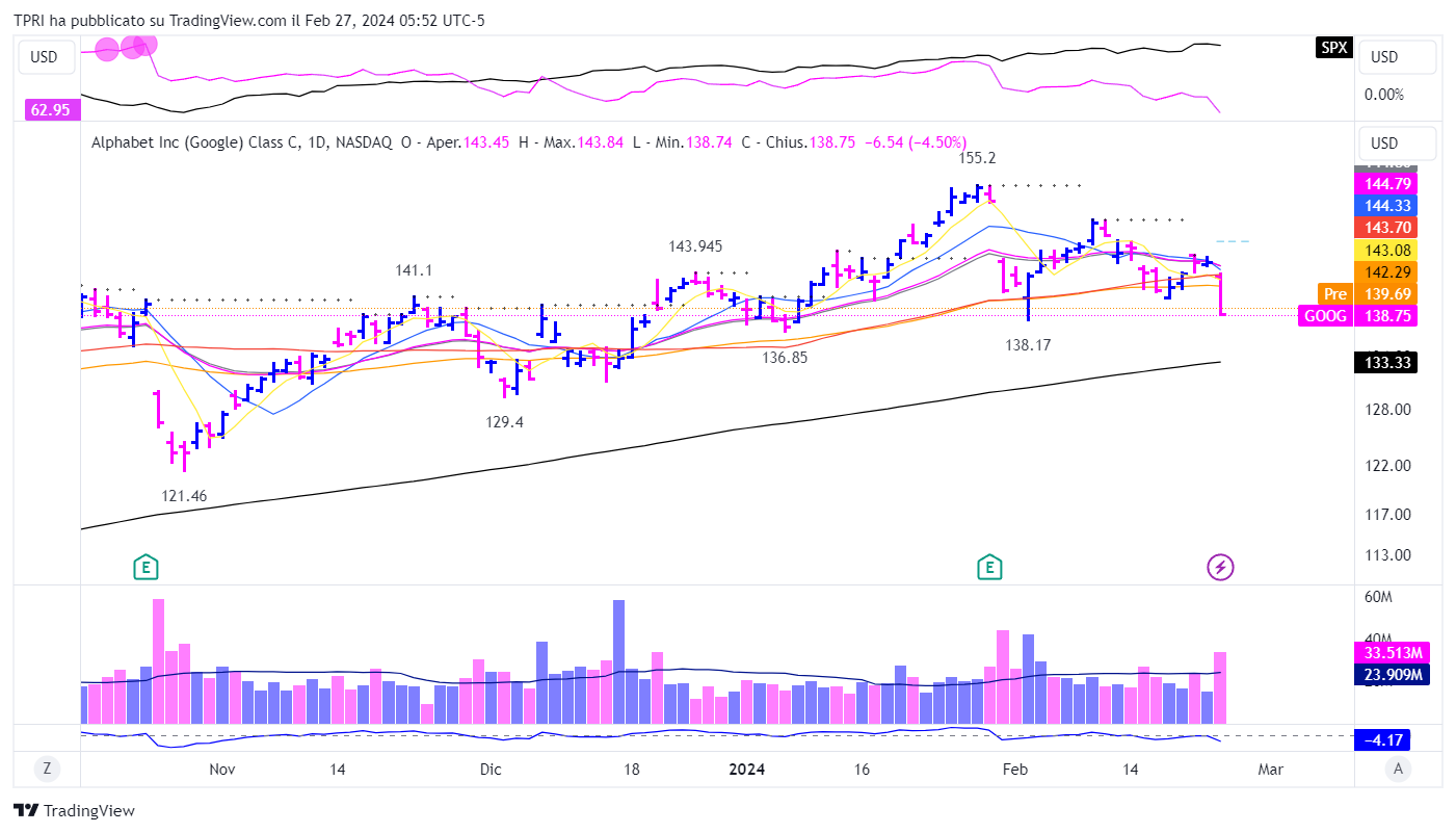 Crollo della casa madre di Google, Alphabet (GOOGL), scivolata del 4,4% e finita ora sotto la SMA50D. L’azienda di recente è stata oggetto di critiche per il suo bot AI Gemini, compresa la rappresentazione errata e ideologizzata di alcuni eventi storici.