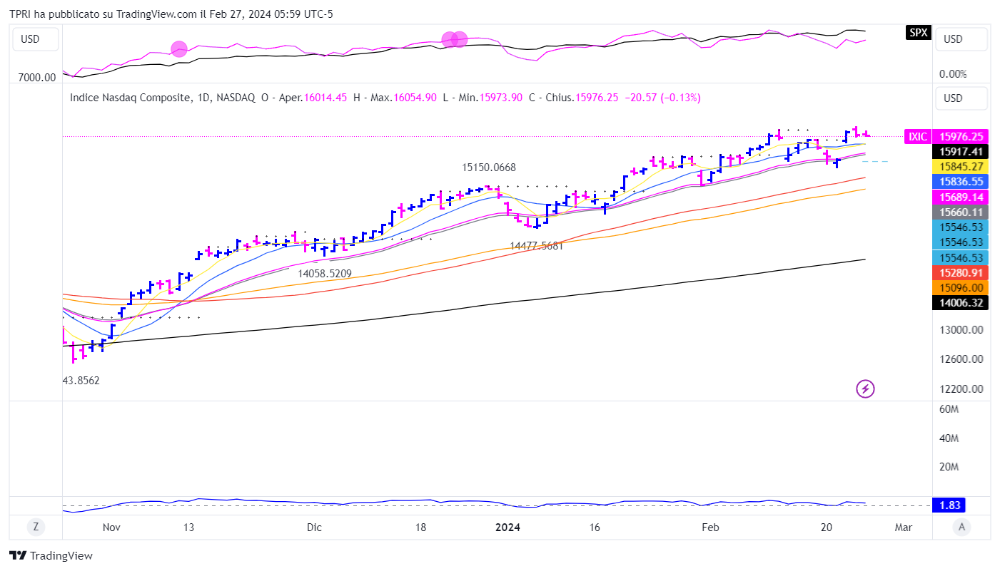 Il Nasdaq è sceso dello 0,1% dopo aver testato nuovamente i 16,000 punti e l’area del picco di novembre 2021.