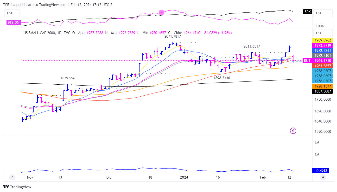Dopo appena un giorno, tutto da rifare per le small-cap, con il Russell2000 che ha perso quasi il 4% trovando supporto sulla SMA50D.