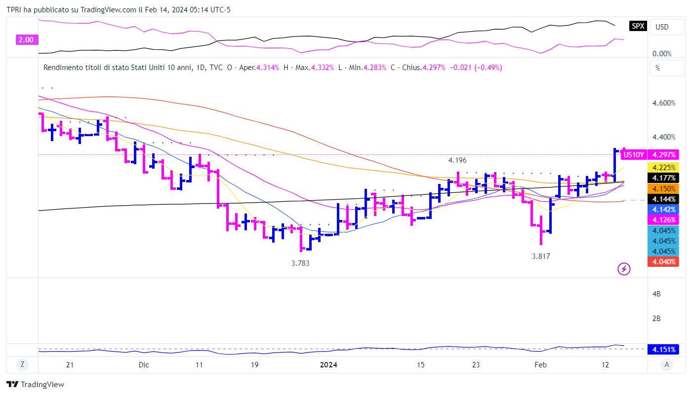 Il CPI spaventa i mercati, con gli indici che hanno aperto in gap-down martedì in seguito ai dati di gennaio sopra le attese e alle reazioni negative alle trimestrali di Shopify (SHOP) e Arista Networks (ANET). Il Dow Jones ha rotto in maniera decisa la SMA10D e la EMA21D.