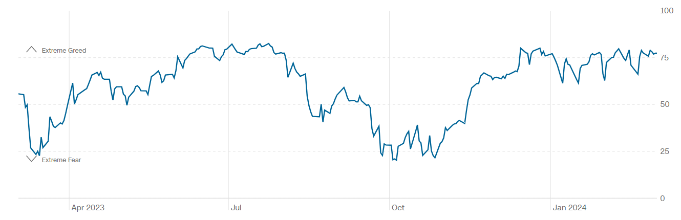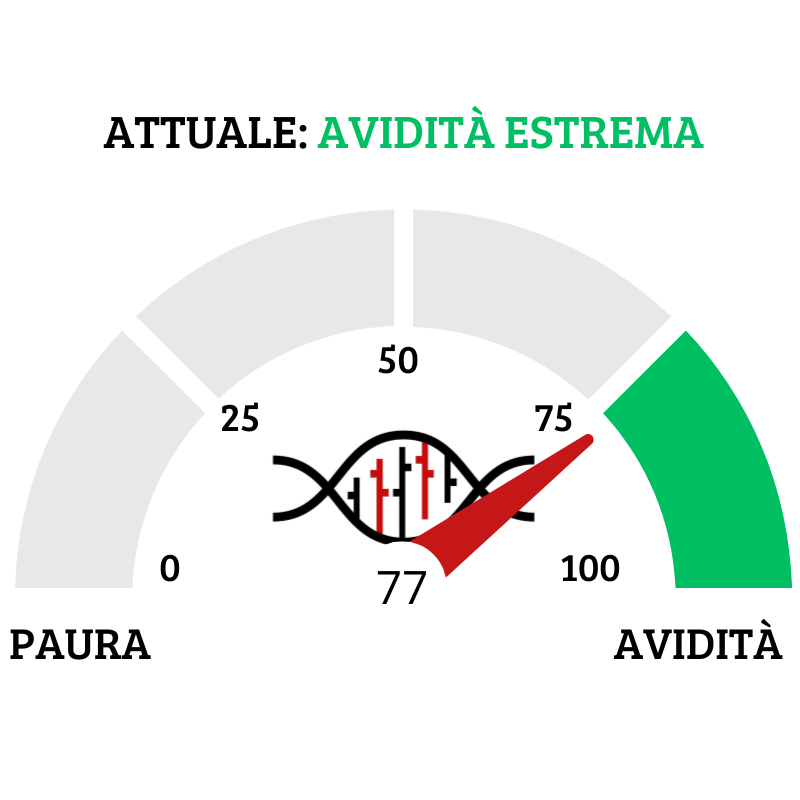 Il Fear&Greed Index scende a quota 77, indicando l’avidità estrema come sentiment prevalente. Una settimana fa il valore era pari a 78.