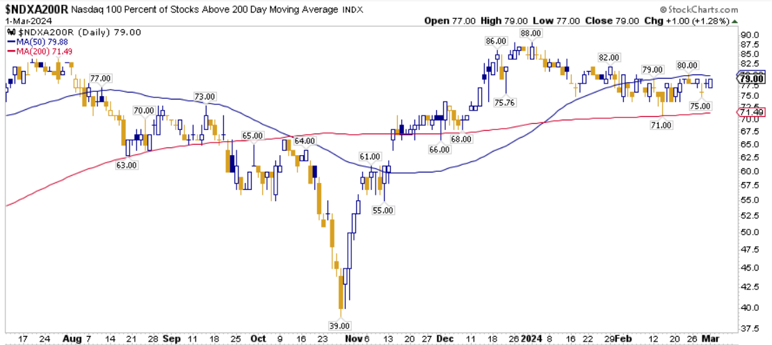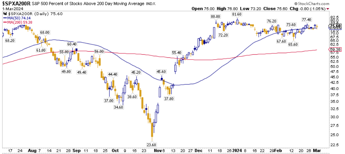 La percentuale dei titoli S&P500 scambiati sopra la loro media mobile a 200 periodi è pari al 75,60%, sul Nasdaq100 il 79,00% dei titoli prezza sopra lo stesso indicatore, mentre sul NYSE la percentuale è pari al 68,13%.