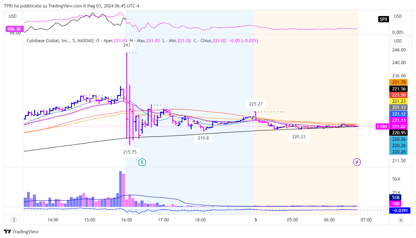 Coinbase ha battuto le previsioni sugli utili, con un aumento del 112% dei ricavi. Il titolo ha reagito in maniera leggermente negativa dopo la pubblicazione  e si trova ancora sotto la SMA50D.