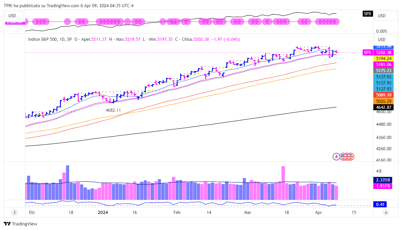 Dopo la rottura delle EMA21 la scorsa settimana, il rally ha perso sprint, con il Dow Jones che balla sulla SMA50D.
