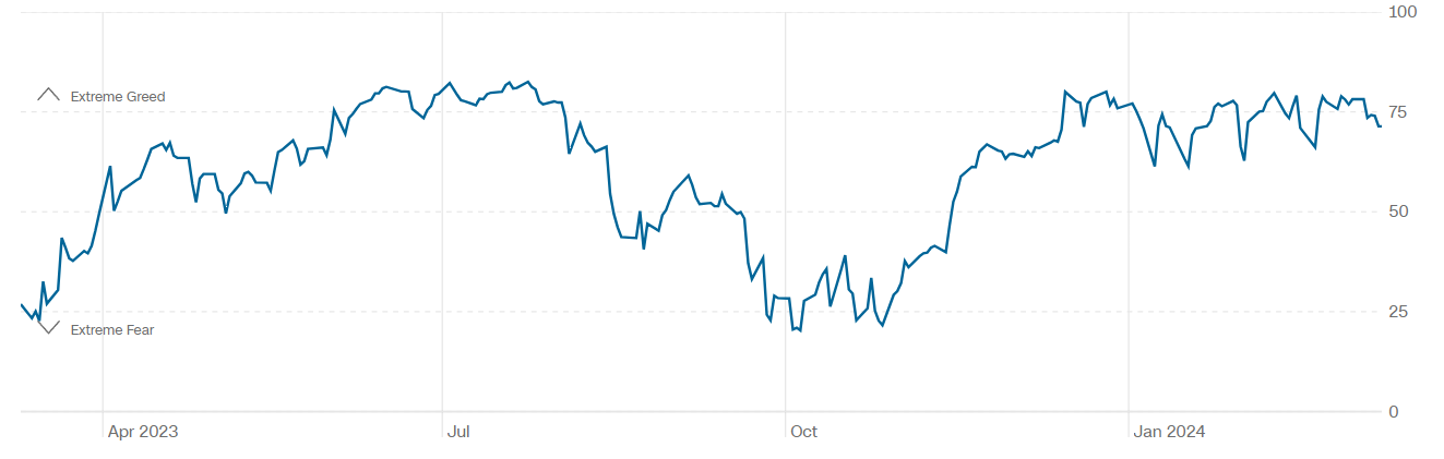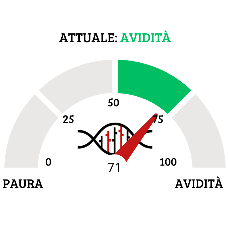 Il Fear&Greed Index scende a quota 71, indicando l’avidità come sentiment prevalente. Una settimana fa il valore era pari a 77.