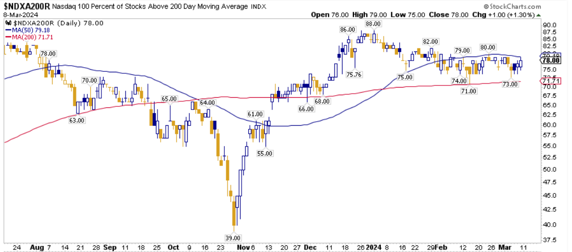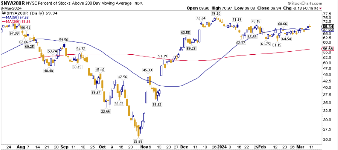 La percentuale dei titoli S&P500 scambiati sopra la loro media mobile a 200 periodi è pari al 79,60%, sul Nasdaq100 il 78,00% dei titoli prezza sopra lo stesso indicatore, mentre sul NYSE la percentuale è pari al 69,34%.