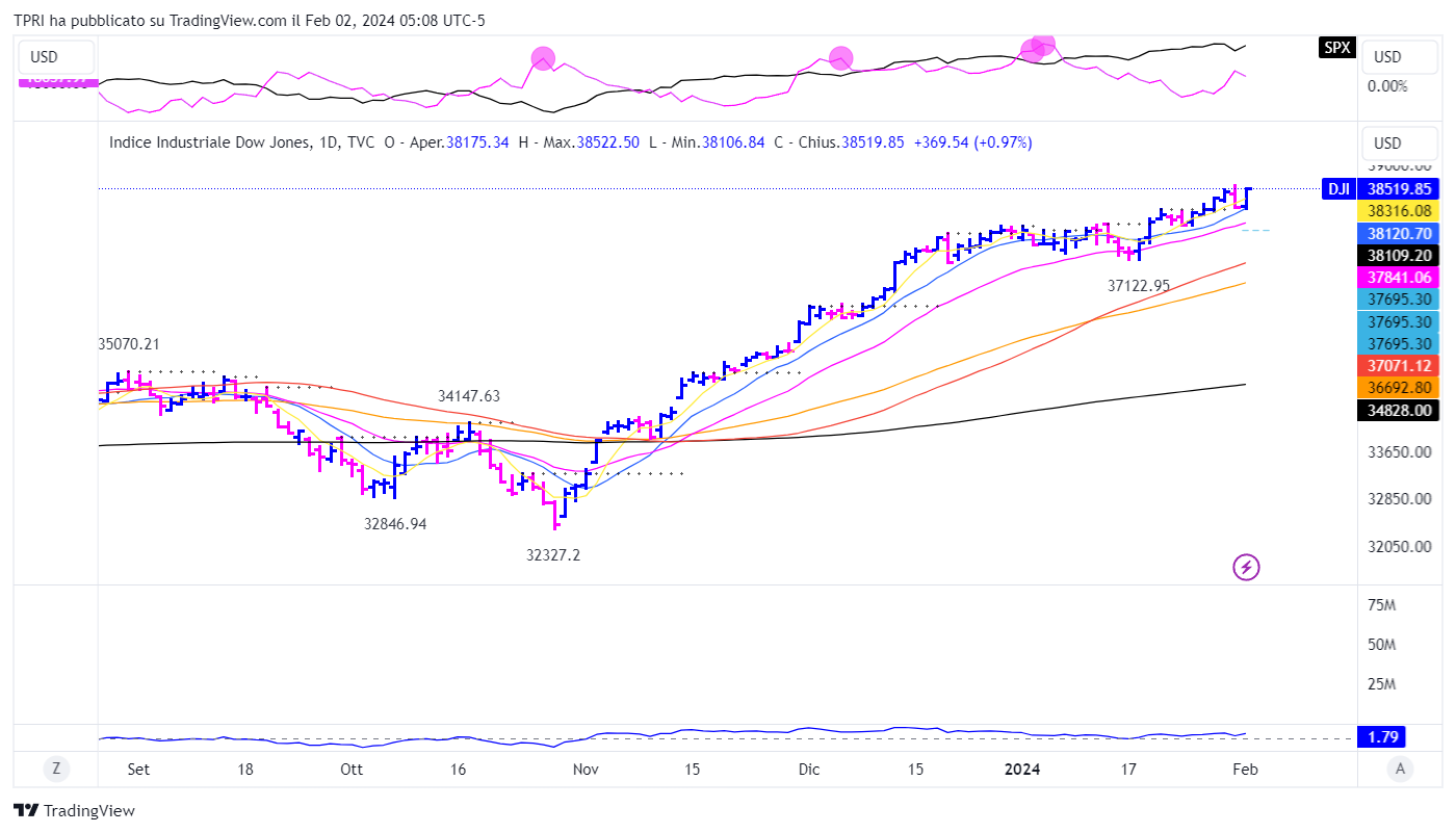 Il Dow Jones  è salito dell’1% durante la sessione di giovedì, segnando una chiusura record. L’indice S&P 500 è aumentato dell’1,25%. Il Nasdaq è balzato dell’1,3%, trovando la spinta dalla EMA21D.