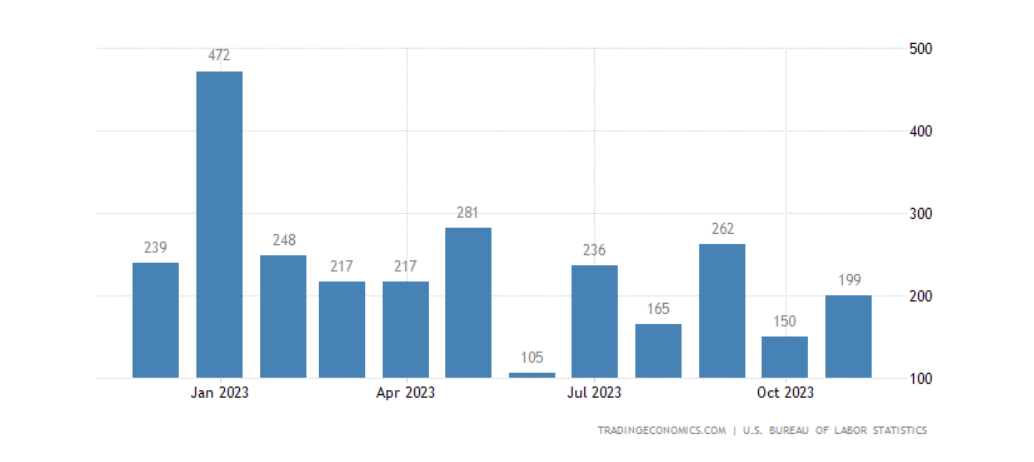 Gli NFP di novembre hanno mostrato 199,000 nuovi posti di lavoro creati. Una fetta importante deriva dallo stop agli scioperi che avevano colpito la manifattura auto nel mese precedente.