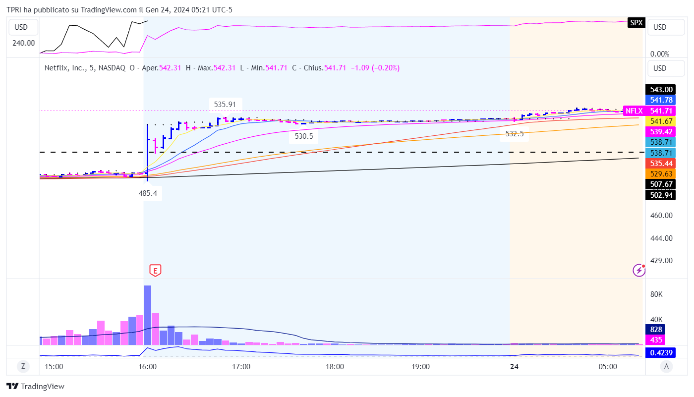 Il titolo NFLX ha registrato un rialzo nel post-market dopo il rilascio della trimestrale nonostante gli utili sotto le attese. Questo grazie al fatto che gli abbonati a Netflix sono cresciuti di 13,1 milioni nel quarto trimestre, al di sopra delle previsioni, grazie al successo delle restrizioni alle password.