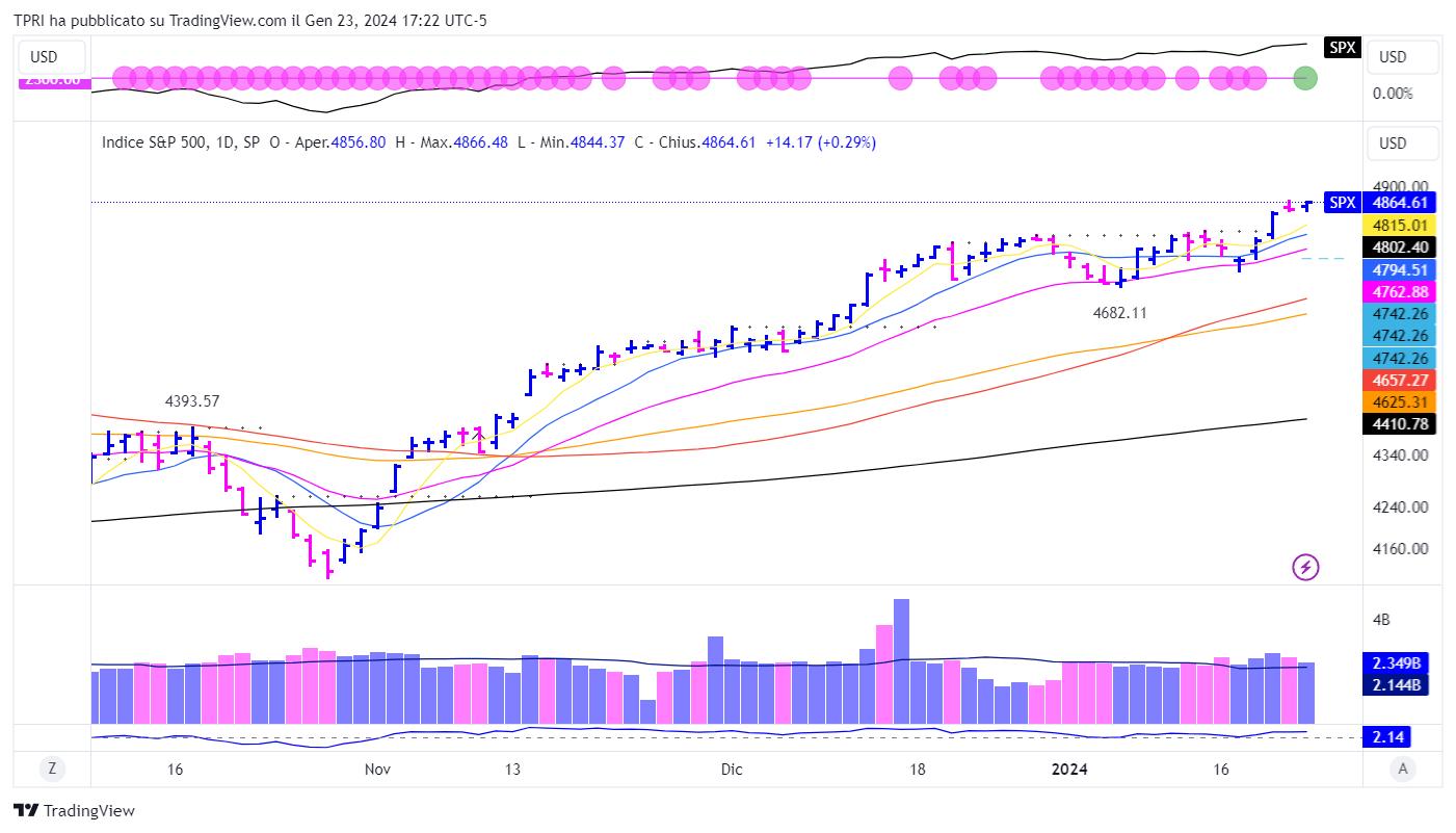 Nuovo record per l’S&500 che ha chiuso martedì a 4864.61 punti, un livello mai toccato prima nella storia. Male invece il Dow Jones, appesantito da $MMM. Abbiamo avuto 135 titoli con bullish breadth vs 531 bearish secondo gli scan R.A.P.T.OR.
