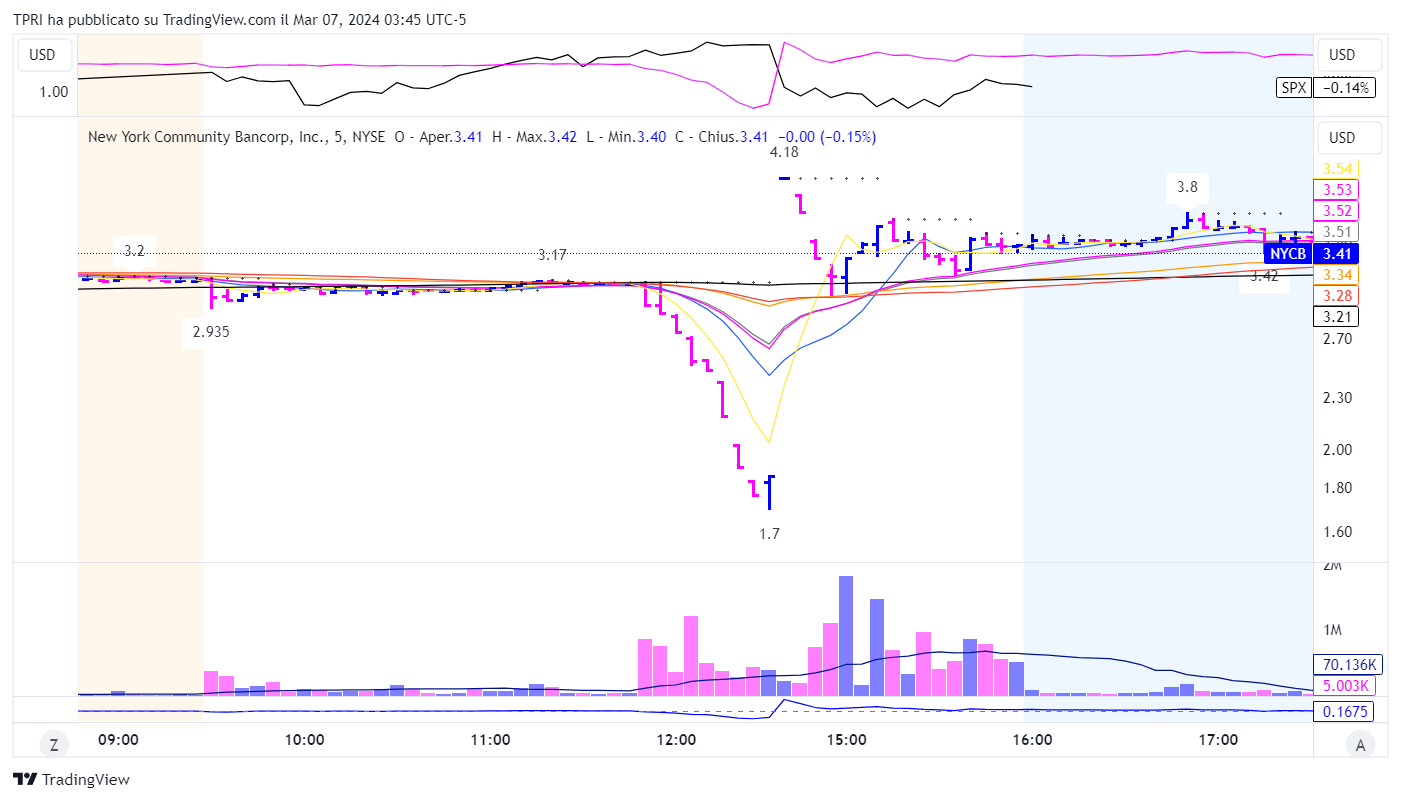 Le azioni della banca regionale New York Community Bancorp sono precipitate di oltre il 40% per poi riprendersi con un guadagno del +7,45% nel pomeriggio.