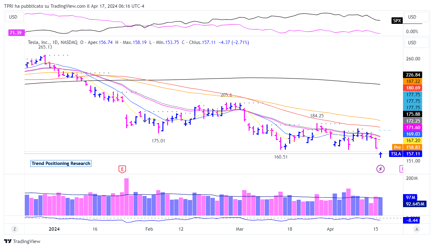 Tesla ha perso il 2,71% a $157,11 martedì, toccando i livelli peggiori dalla fine di aprile 2023.