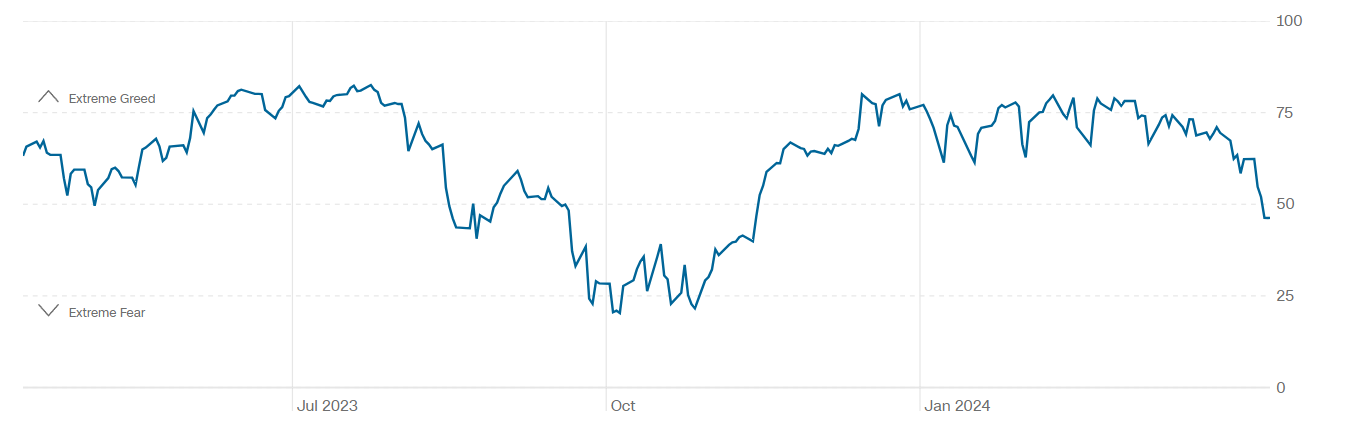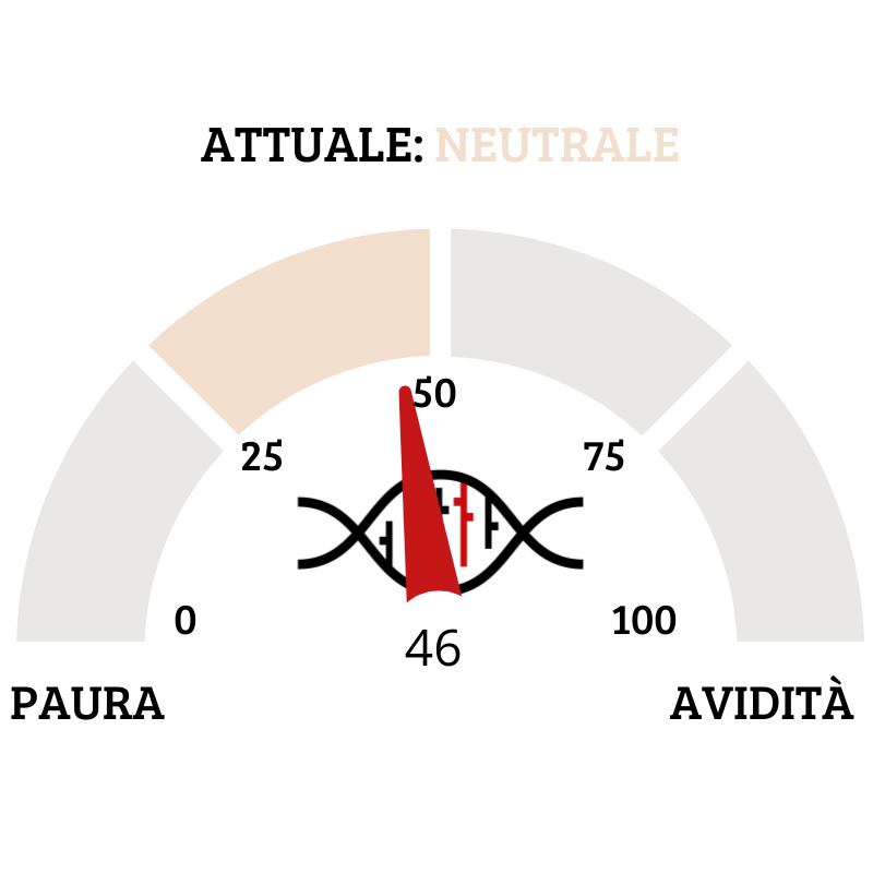 Il Fear&Greed Index scende a quota 46, indicando neutralità come il sentiment prevalente. Una settimana fa il valore era pari a 61.