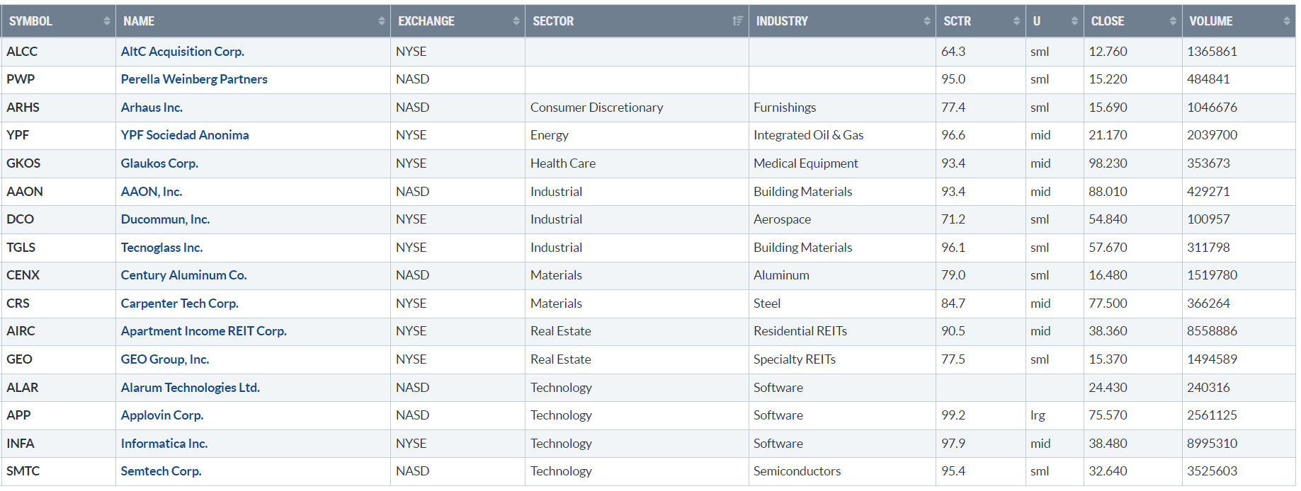 Di seguito i titoli che hanno creato un nuovo massimo a 52 settimane, e stanno sovraperformando l’indice di riferimento S&P500.
