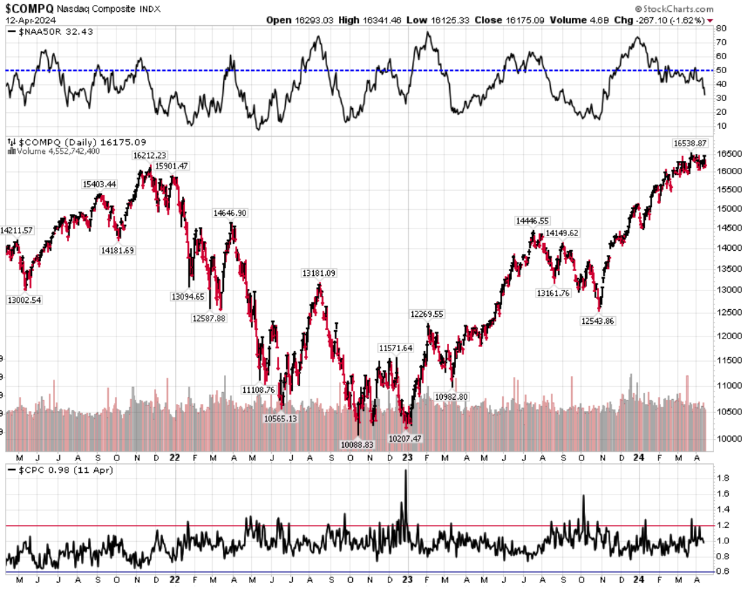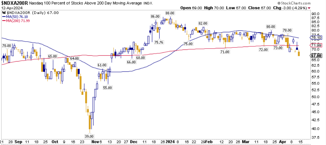 L’Invesco S&P500 Equal Weight (RSP) è sceso del 2,65%, tagliando al ribasso la SMA50D venerdì. Il Nasdaq100 Equal Weighted Index ETF (QQEW) è scivolato dell’1,66%, sotto la SMA50D ai peggiori livelli da fine febbraio.