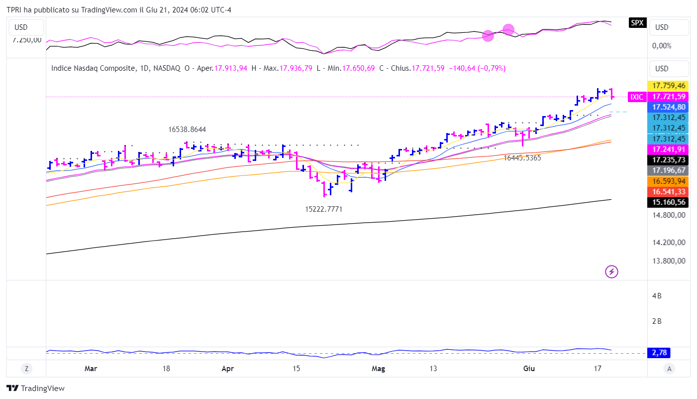 Il Dow Jones infatti è salito dello 0,77%, rimbalzando dalla SMA50D e superando i massimi delle ultime settimane. L’S&P500 è sceso dello 0,25%, mentre il Nasdaq ha perso lo 0,79%.