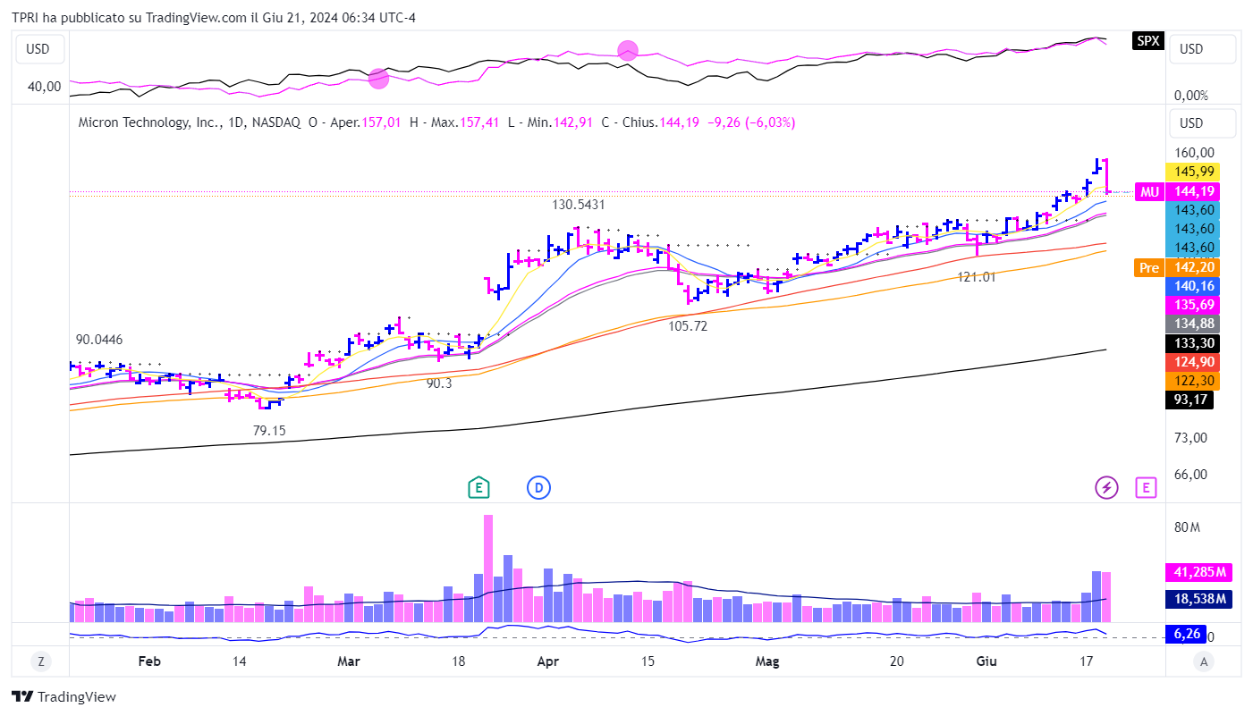 Micron è crollato del 6% a $144,19, un giorno dopo aver toccato un massimo storico. Micron pubblicherà la trimestrale il 26 giugno.
