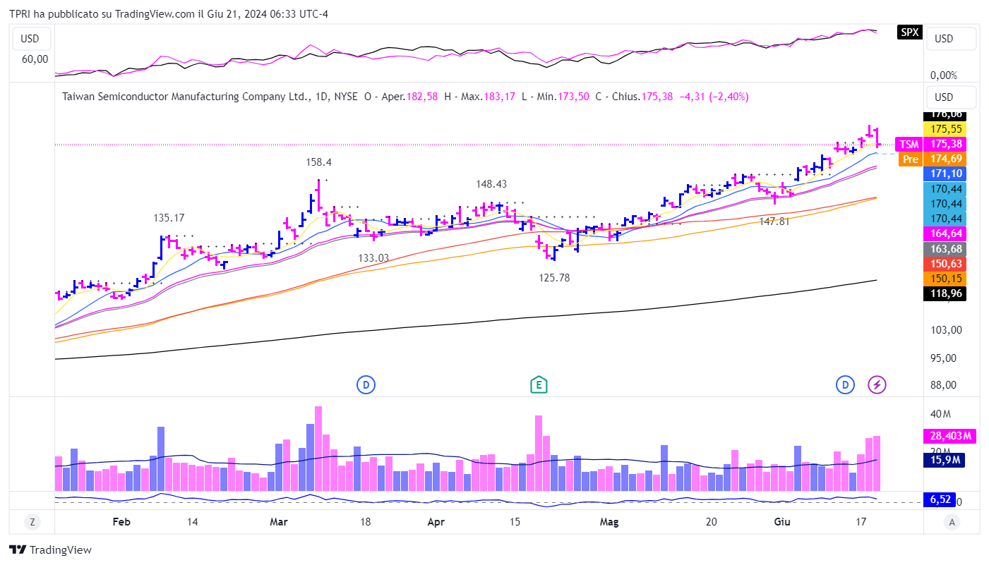 Taiwan Semiconductor ha ceduto il 2,4% a $175,38, dopo che il produttore di chip per Nvidia aveva raggiunto un massimo storico.