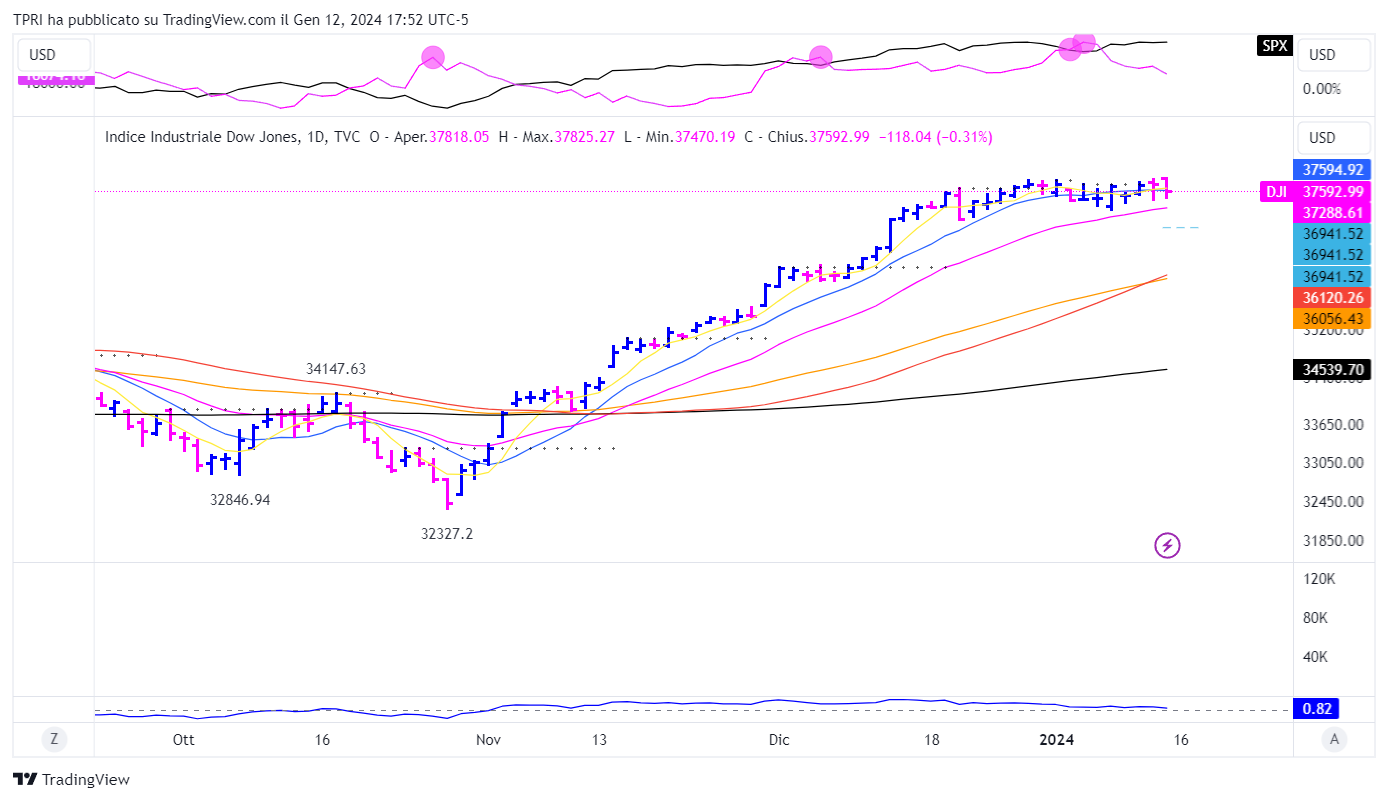 Il Dow Jones ha chiuso in rosso la sessione di venerdì, appesantito dalle trimestrali delle banche deludenti, come quelle di JPMorgan Chase (JPM) e Bank of America (BAC). Meta Platforms (META) ha guidato le Sette Sorelle mentre Tesla (TSLA) è stata ancora fra le laggard.