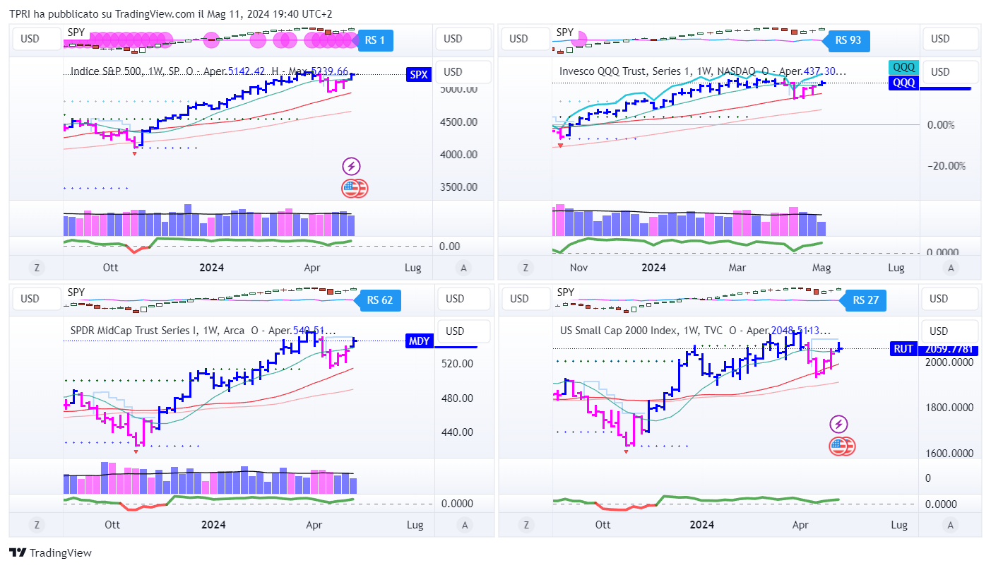 L’S&P500 ha registrato un avanzamento dello 0,2% venerdì, ma la sua crescita settimanale è stata più consistente, pari all’1,9%, portandolo l’ 1,5% sopra la SMA10W. Il benchmark è avanti rispetto al Nasdaq, grazie a un aumento del 9,5% fino ad ora nel 2024.